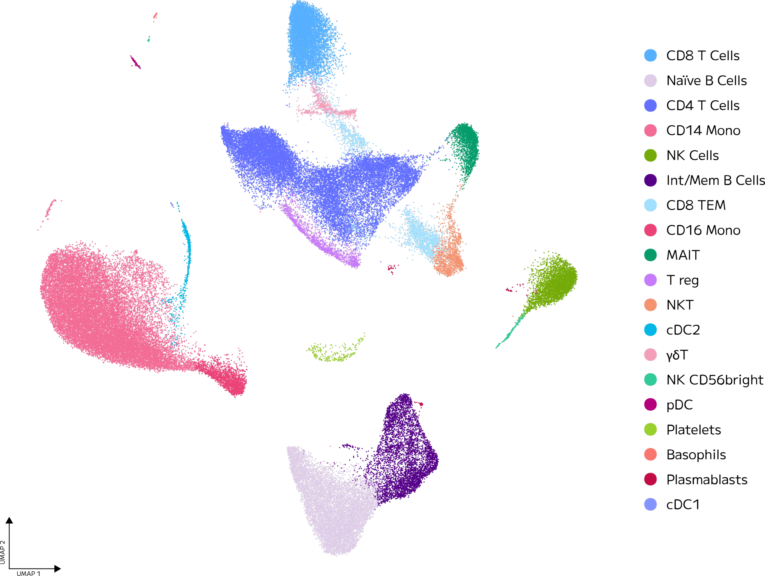 - Clear separation and identification of major immune cell populations