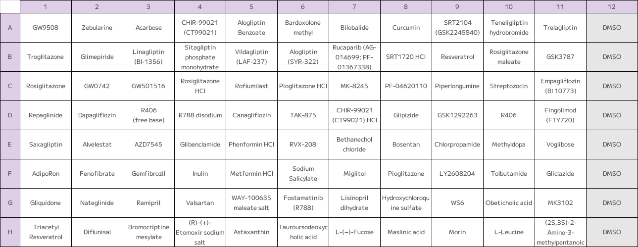 Each well contained a single drug at 10 µM or a DMSO control, including diverse classes such as insulin sensitizers, sulfonylureas, and DPP-4 inhibitors.