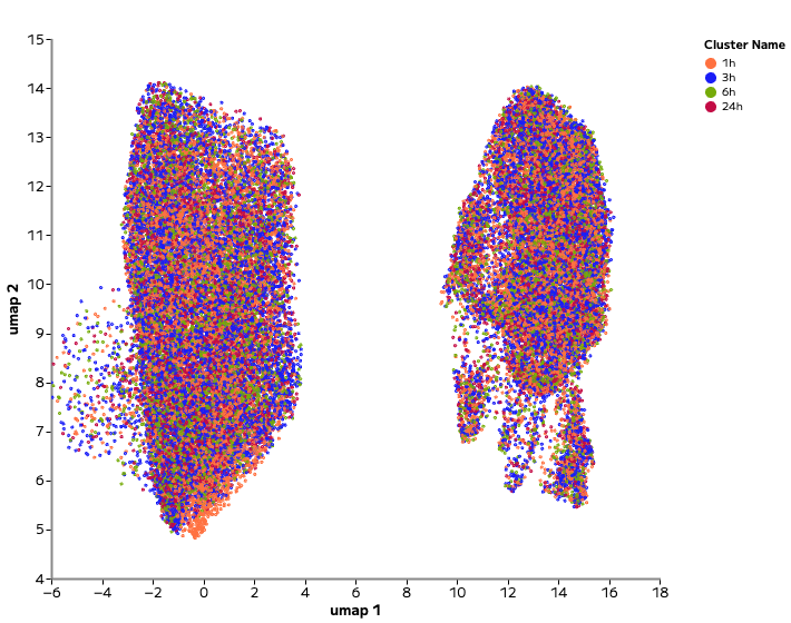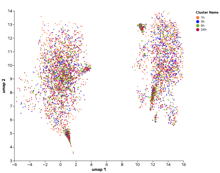 Single cell profiling resolved both dramatic and nuanced transcriptional responses. For example, Piperlongumine, an inducer of cell death, drove strong transcriptional shifts and cluster separation across time points (Figure 2). In contrast, Sitagliptin, a DPP-4 pathway inhibitor, produced a much more subtle shift within the existing cell type cluster (Figure 3).