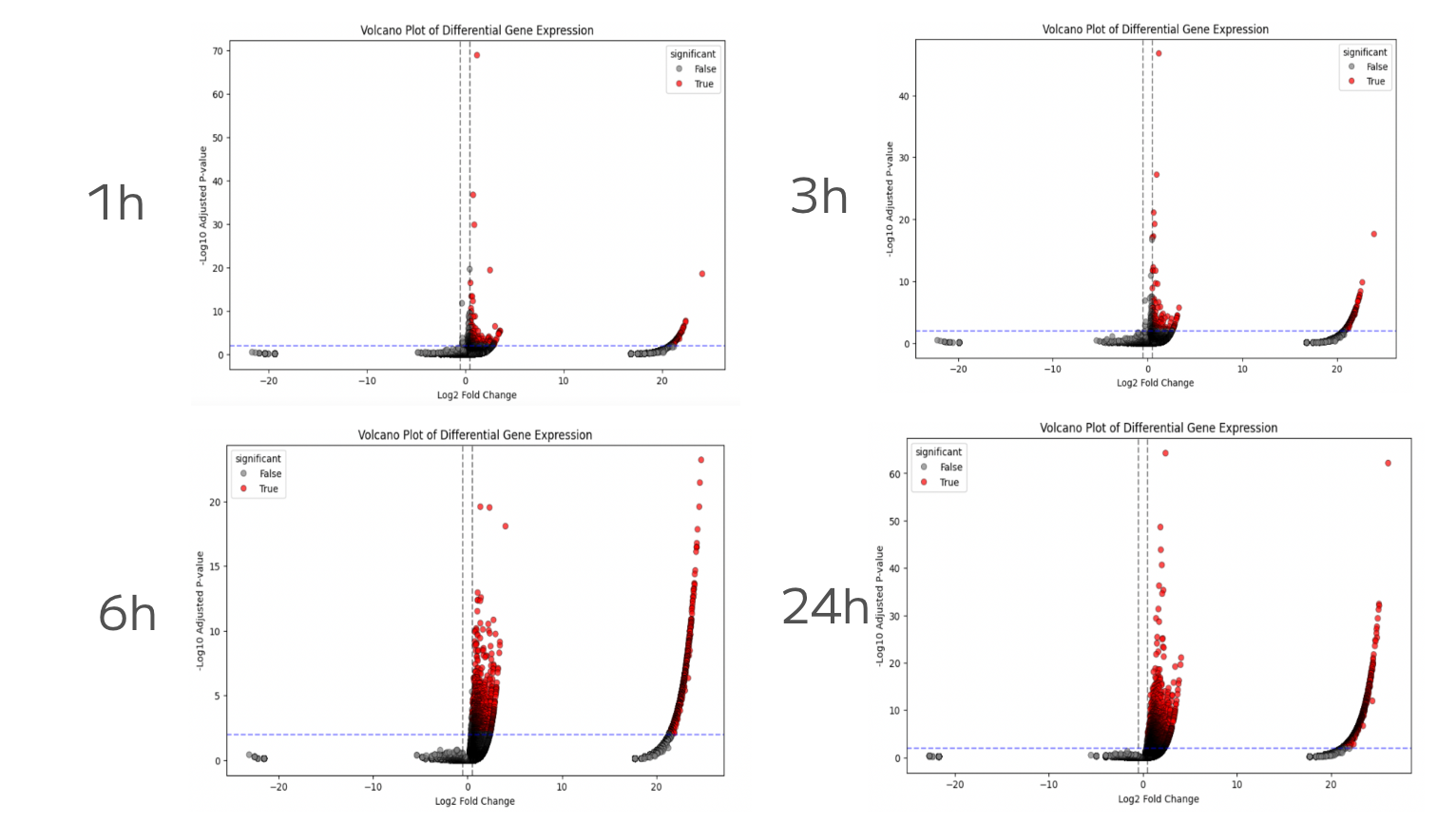 Figure 5: Temporal Dynamics of Sitagliptin Response. Volcano plots showing time-resolved differential gene expression from 1h to 24h. The two clusters illustrate the bimodality of gene changes: points on the far right represent strongly upregulated genes, while those closer to the center reflect more subtle but still statistically significant changes. Red dots indicate differentially expressed genes consistently observed across time points, whereas black dots represent noise.