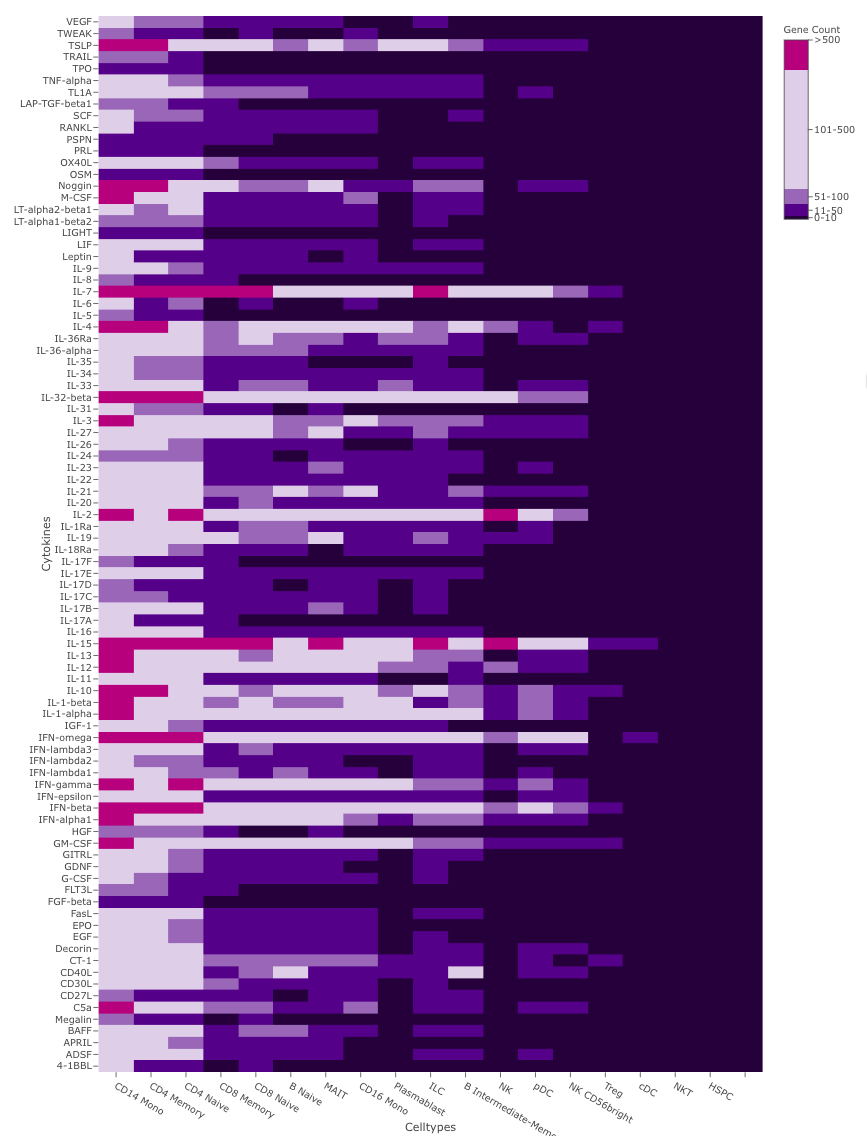 Differential expression (DE) analysis was performed to calculate the number of genes upregulated in response to cytokine treatment across all cell types (Figure 3). Many cytokines induce big transcriptional changes reflected by the upregulation of more than 50 genes.