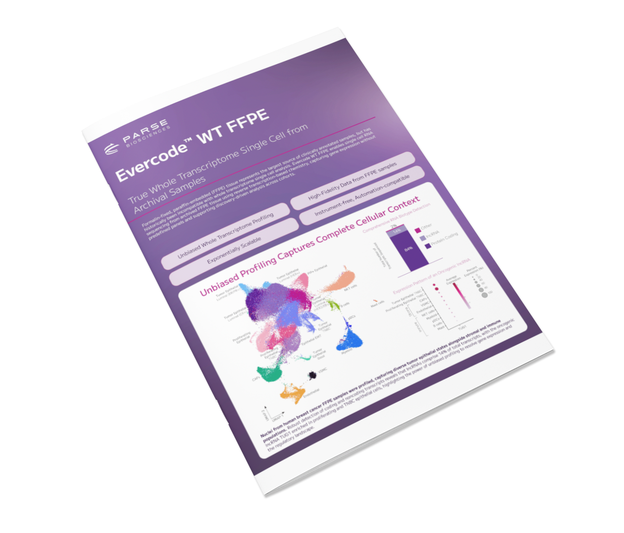 Formalin-fixed, paraffin-embedded (FFPE) tissue represents the largest source of clinically annotated samples, but has historically been incompatible with whole transcriptome single cell analysis. Evercode WT FFPE enables single cell RNA sequencing from archived FFPE tissue using reverse transcription-based chemistry, capturing gene expression without predefined panels and supporting discovery-driven analysis across cohorts.